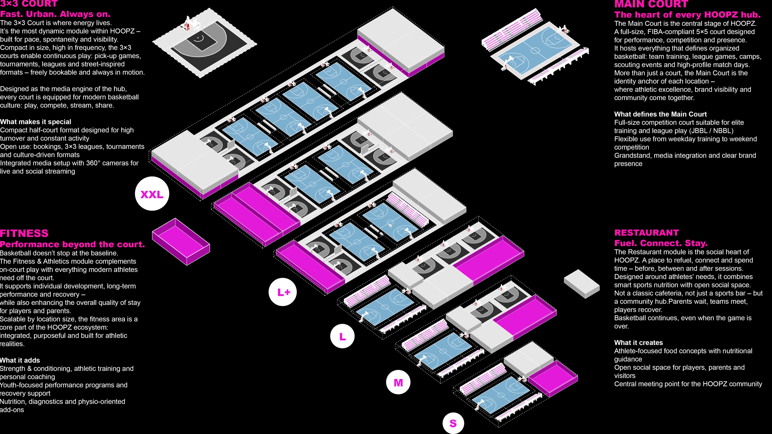 Basketball Community, Club, Gym, Athletes’ Restaurant and Performance Academy - reimagined. HOOPZ connects structured Development, open Access and Basketball Culture into one flexible Urban Platform.